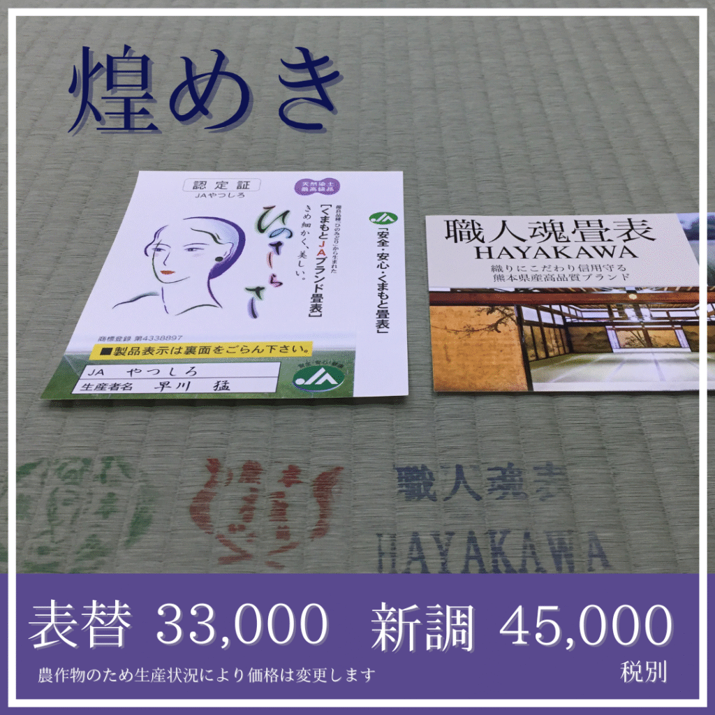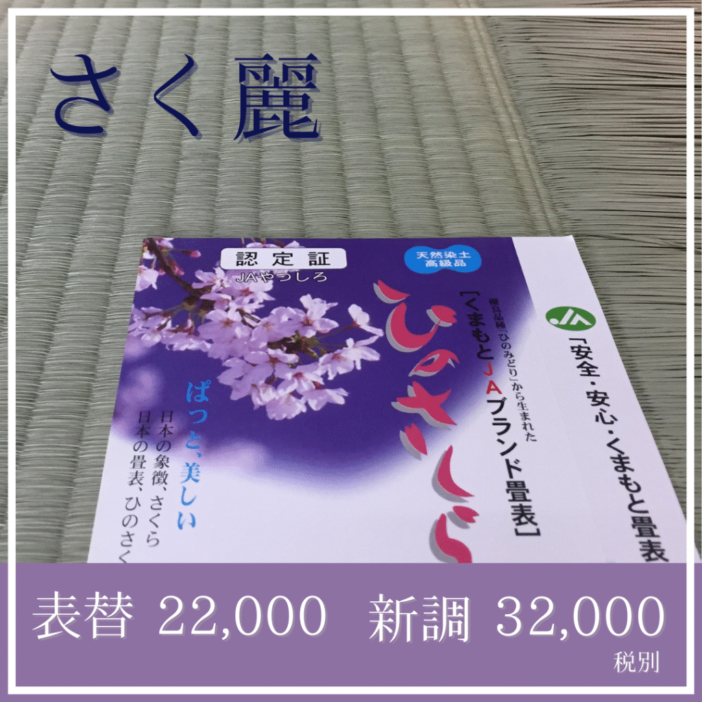 熊本い業協同組合推薦 高級ブランド畳表 『ひのさくら』または、それと同等クラスを使用。