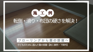 施工例 転落・滑り・布団の硬さを解決!子どものために選んだ畳の部屋【施工事例・下関市】(フローリング→和室) 「フローリングに布団を敷くと硬くて、赤ちゃんが可哀想…」「ベッドだと寝相の悪い子どもが落ちてしまって心配…」「子どもが安心して遊べるスペースをつくってあげたい」 子育て中のご家庭から、こんなお悩みをいただくことがあります。今回はフローリング... 2026.04.20 施工例